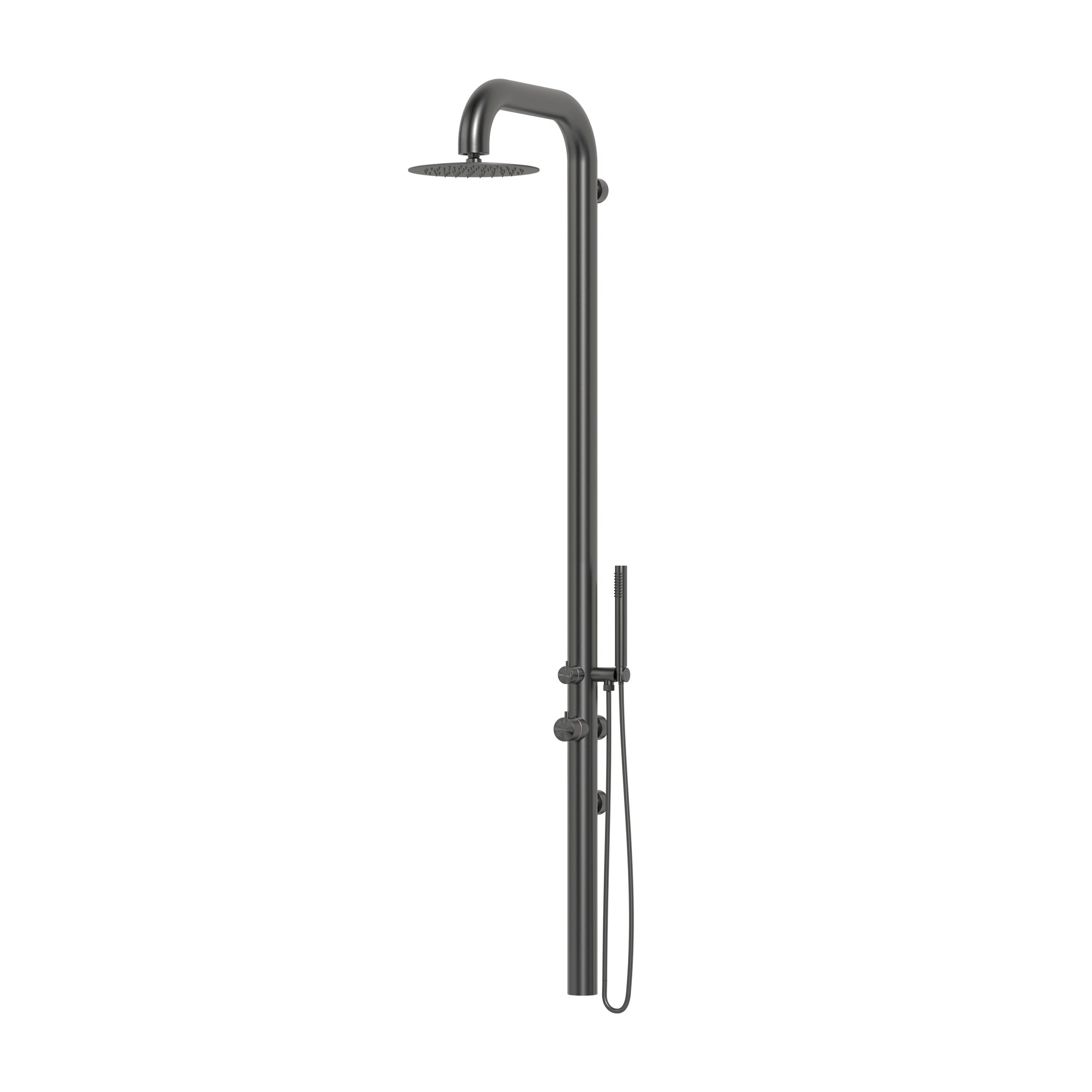 Wall mounted outdoor shower with pressure balance valve, two-way diverter, rain shower head, and handheld made from 316 marine grade stainless steel.